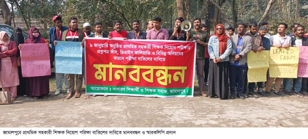 জামালপুরে প্রাথমিক সহকারী শিক্ষক নিয়োগ পরিক্ষা বাতিলের দাবিতে মানববন্ধন ও স্মারকলিপি প্রদান