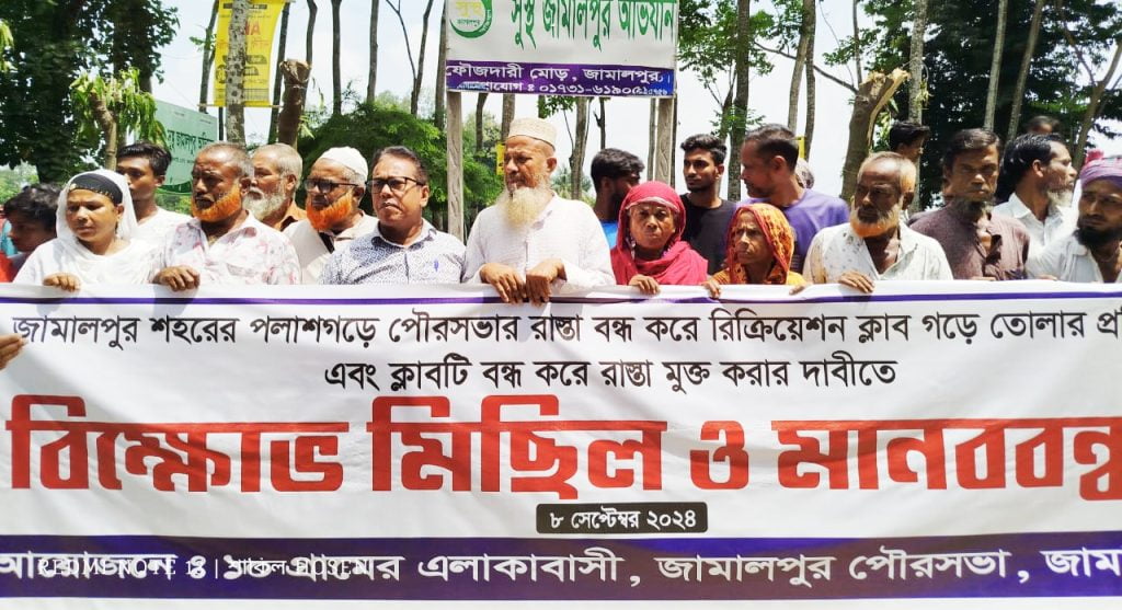 জামালপুর রিক্রিয়েশন ক্লাব বন্ধ করে রাস্তা মুক্ত করার দাবিতে বিক্ষোভ মিছিল ও মানববন্ধন।