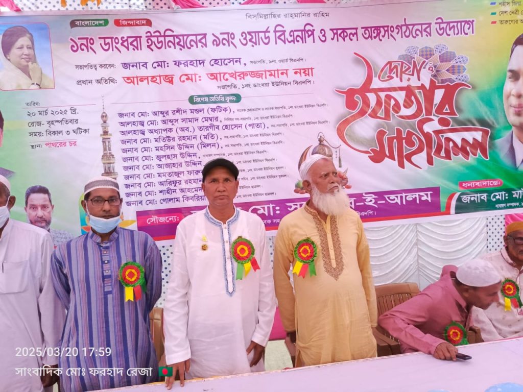 আজ বৃহস্পতিবার (২০ মার্চ) বিকেলে উপজেলার ডাংধরা ইউনিয়নের পাথরের চর ৯ নং ওয়ার্ড বিএনপি ও অঙ্গ সহযোগী সংগঠনের আয়োজনে এ দোয়া ও ইফতার মাহফিল অনুষ্ঠিত হয়।