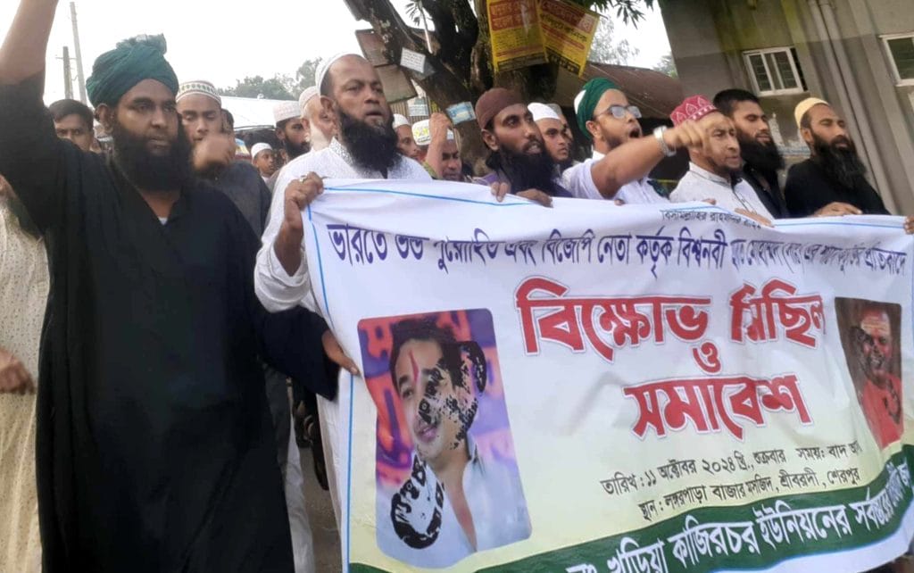ভারতে হিন্দু পুরোহিত রামগিরি মহারাজ কর্তৃক মহানবী (সাঃ) কে নিয়ে কটুক্তি এবং তার সমর্থনকারী বিজেপি নেতা নিতেশ নারায়ণের গ্রেফতার ও বিচারের দাবিতে শুক্রবার (১১ই অক্টোবর) বিকালে শেরপুরের শ্রীবরদী উপজেলার খড়িয়া কাজির চর ইউনিয়নের লংগরপাড়া বাজারে সর্বস্তরের তৌহিদী জনতা ও মুুসল্লীগণের আয়োজনে বিক্ষোভ মিছিল ও সমাবেশ অনুষ্ঠিত হয়েছে।