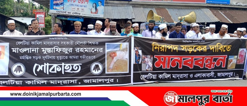 মানববন্ধনে বক্তারা জানান, ঢাকা-জামালপুর মহাসড়কের পাশে অবস্থিত জামালপুর সদর পৌরসভাধীন বেলটিয়া টিবওয়েলপাড় মোড়টি (বাইপাস) একটি ব্যস্ততম স্থান। এটি এখন মৃত্যুঝুঁকি ও দুর্ঘটনাপ্রবণ এলাকা। মোড়টি একই সঙ্গে টাঙ্গাইল, জামালপুর ও সরিষাবাড়ি যাতায়াতের একটি গুরুত্বপূর্ণ পয়েন্ট। অথচ মোড়ের সামনে চালকদের জন্য কোন সর্তকতা নির্দেশক নেই। মোড়টির ত্রিমুখী বক্রতার জন্য দুর্ঘটনা ও প্রাণহানি ক্রমাগত বাড়ছেই।