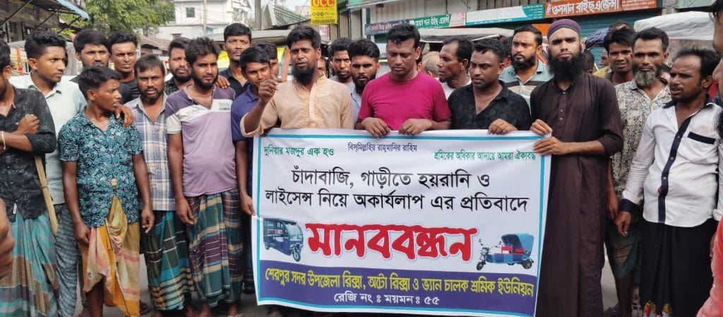 শেরপুর শহরের রাস্তা অবরোধ করে বিক্ষোভ করছে শেরপুরের রিকশা শ্রমিকরা। পহেলা অক্টোবর মঙ্গলবার দুপুরে শেরপুর বটতলা মোড়ে পৌরসভা গেটের সামনে রাস্তা অবরোধ করে এই বিক্ষোভ শুরু করে রিকশা শ্রমিকরা। এই রাস্তা অবরোধের কারণে শেরপুর সদর হাসপাতালে যাতায়াত করতে পারছে না রোগীরা। রিক্সা শ্রমিকদের অভিযোগ প্রত্যেক রিকশা থেকে প্রত্যেকদিন ৩০০ টাকা করে চাদা দাবি করেছে শেরপুর পৌরসভা। তাই আমরা রাস্তা অবরোধ করে বিক্ষোভ কর্মসুচি পালন করছি।অন্যদিকে শেরপুর পৌরসভার প্রশাসক বলছেন রিক্সা শ্রমিকদের কাছ থেকে কোন প্রকার চাঁদা নেওয়া হয়নি।
