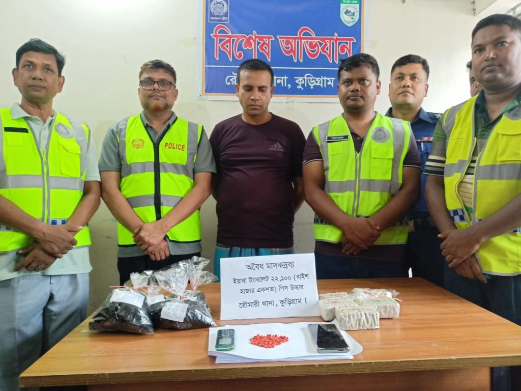 রৌমারী থানার ভারপ্রাপ্ত কর্মকর্তা (ওসি) লুৎফর রহমান জানান, সোমবার সকালে গোপন সংবাদের ভিত্তিতে উপজেলার সদর ইউনিয়নের চর নতুনবন্দর এলাকায় অভিযান চালায় পুলিশ। এ সময় বাড়ি থেকে ২২ হাজার ১০০ পিস ইয়াবাসহ রফিক হোসেন নামে এক মাদক ব্যবসায়ীকে আটক করা হয়।