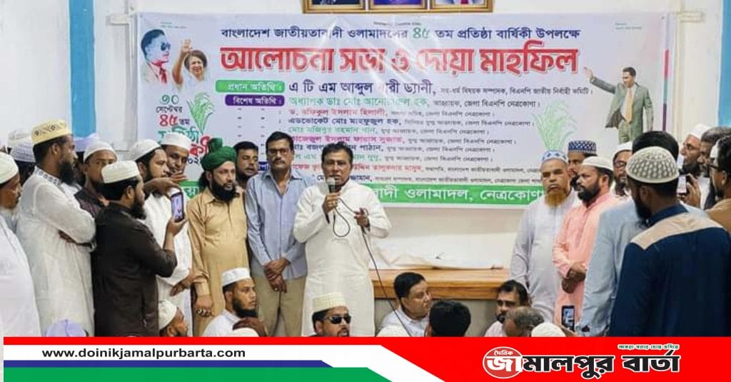 বাংলাদেশ জাতীয়তাবাদী ওলামাদলের ৪৫ তম প্রতিষ্ঠা বার্ষিকী উপলক্ষে নেত্রকোনা জেলা ওলামাদল কর্তৃক আয়োজিত আলোচনা ও দোয়া মাহফিলে হাঃক্বারী মিসবাহউল্লাহ মাসুদের সভাপতিত্বে প্রধান অতিথি উপস্থিত ছিলেন ঢাকা বিশ্ববিদ্যালয়ের সবুজ চত্ত্বর থেকে বেড়ে উঠা সোনালী ফসল সাবেক ছাত্রনেতা,কেন্দ্রীয় বিএনপির কার্যনির্বাহী কমিটির সহ-ধর্ম বিষয়ক সম্পাদক