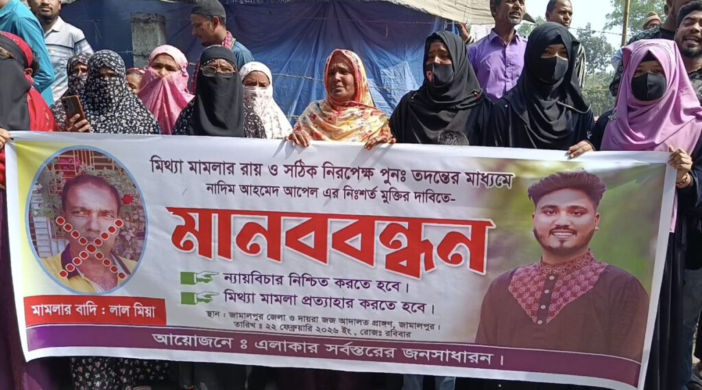 রাকিব হোসেন, জামালপুর প্রতিনিধি : জামালপুরে মিথ্যা মামলার রায় বাতিল এবং সঠিক ও নিরপেক্ষ পুনঃতদন্তের মাধ্যমে নাদিম আহমেদ আপেলের নিঃশর্ত মুক্তির দাবিতে এক বিশাল মানববন্ধন কর্মসূচি পালিত হয়েছে।