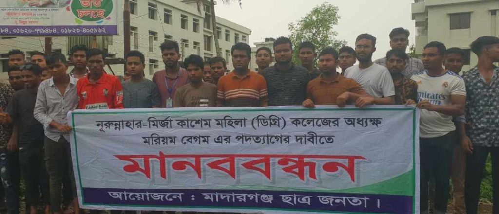 জামালপুরের মাদারগঞ্জে অধ্যক্ষের পদত্যাগের দাবীতে মানববন্ধন ও বিক্ষোভ মিছিল অনুষ্ঠিত হয়েছে। নুরুন্নাহার মির্জা কাশেম মহিলা ডিগ্রি কলেজের অধ্যক্ষ মরিয়ম বেগম এর পদত্যাগের দাবীতে বুধবার দুপুরে মাদারগঞ্জ পৌরসভার পুরাতন ভবনের সামনে থেকে কলেজ প্রাঙ্গণ পর্যন্ত বিভিন্ন স্লোগানে বিক্ষোভ মিছিল ও মানববন্ধন করে ছাত্র-জনতা। মানববন্ধন ও বিক্ষোভ মিছিল শেষে ছাত্র-জনতার পক্ষে কলেজের শিক্ষকদের মিলনায়তনে বক্তব্য রাখেন উপজেলা ছাত্রদলের সদস্য সচিব ফাহাদ হোসেন, সিনিয়র যুগ্ম-আহবায়ক রাকিবুল ইসলাম বকুল, যুগ্ম-আহবায়ক মোস্তাফিজুর রহমান হারুন প্রমুখ। এ সময় অত্র কলেজের দায়িত্বরত কয়েকজন শিক্ষক ছাত্রদল নেতাদের প্রশ্নের জবাব দেন। এসময় ছাত্র জনতাসহ ছাত্রদলের নেতৃবৃন্দ উপস্থিত ছিলেন।