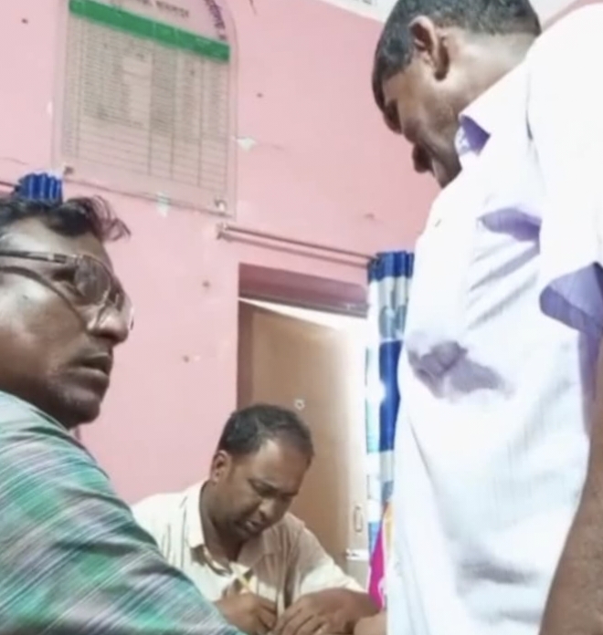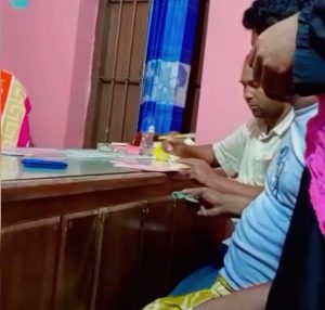 তার পাশে বসা ইউপি সদস্য মোবারক হোসেন ও ইউনিয়ন শ্রমিক দলের সাংগঠনিক সম্পাদক সুজন সুবিধাবীদের কাছ থেকে ২০০ টাকাসহ কার্ড নিয়ে স্বাক্ষর করছেন।