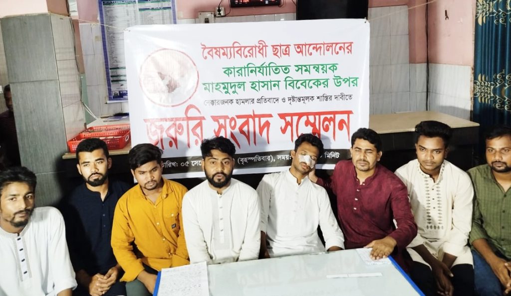 বৈষম্যবিরোধী ছাত্র আন্দোলনের কারানির্যাতিত সমন্বয়ক মাহমুদুল হাসান বিবেকের উপর অর্তিকত হামলা করে ভুয়া সমন্নয়ক দাবি করা কিছু লোক ।