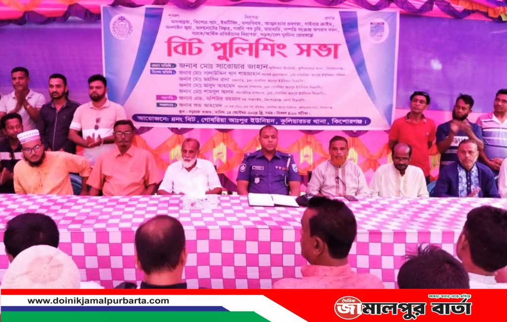 “পুলিশই জনতা, জনতাই পুলিশ” এ স্লোগানকে হৃদয়ে ধারন করে কিশোরগঞ্জের কুলিয়ারচরে মাদকদ্রব্য, কিশোরগ্যাং, ইভটিজিং, বাল্যবিবাহ, আত্মহত্যার প্রবণতা, সাইবার ক্রাইম, অনলাইন জুয়া, জালনোটের বিস্তার, গবাদি পশু চুরি, মারামারি, সম্পত্তি সংক্রান্ত অপরাধ দমন, ব্যাংক ও আর্থিক প্রতিষ্ঠানের নিরাপত্তা, সড়ক ও রেল দুর্ঘটনা রোধকল্পে বিট পুলিশিং সভা অনুষ্ঠিত হয়েছে।