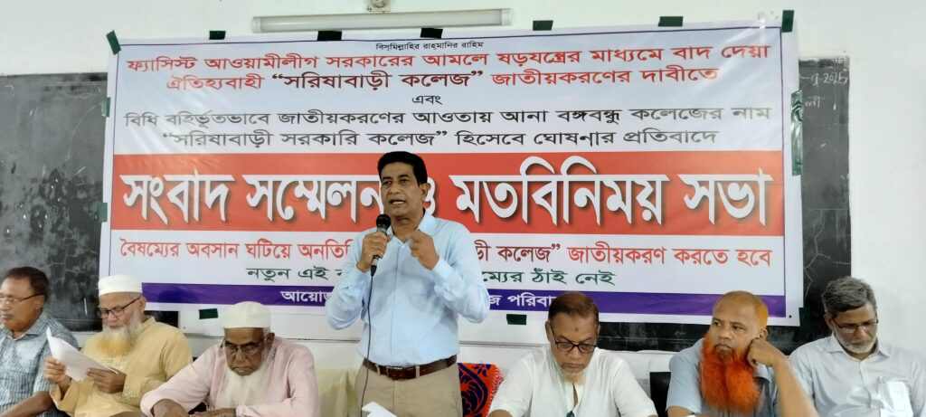 তৌকির আহাম্মেদ হাসু, সরিষাবাড়ি : আ.লীগ শাসন আমলে বৈষম্যের শিকার হওয়া জামালপুরের ঐতিহ্যবাহী “সরিষাবাড়ী কলেজ” জাতীয়করণে দাবি ও বঙ্গবন্ধু কলেজের নাম পরিবর্তন করে “সরিষাবাড়ী সরকারি কলেজ” নামকরনের প্রতিবাদে সংবাদ সম্মেলন ও মতবিনিময় সভা অনুষ্ঠিত হয়েছে।শনিবার দুপুরে সরিষাবাড়ী কলেজ মিলনায়তনে হলরোমে এ সংবাদ সম্মেলন ও মতবিনিময় সভা করে বৈষম্যের শিকার হওয়া সরিষাবাড়ী কলেজ কতৃর্পক্ষ।