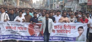 বুধবার (২৬ ফেব্রুয়ারি) বিকেলে শহরের গেইট পাড় এলাকা থেকে এক বিক্ষোভ মিছিল বের হয়। মিছিলটি শহরের প্রধান সড়ক প্রদক্ষিণ করে বকুলতলায় গিয়ে শেষ হয়।