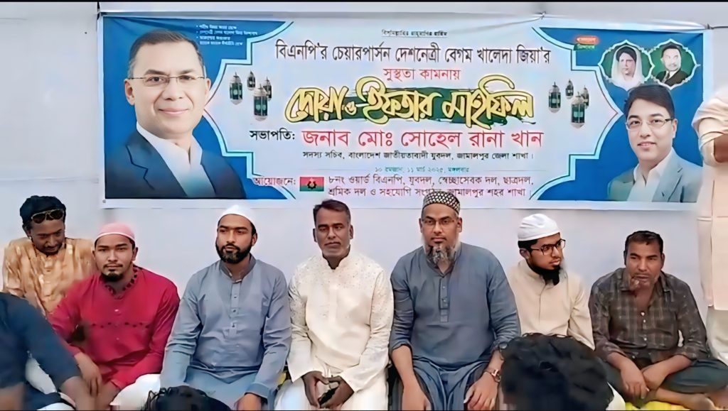 নিজস্ব প্রতিবেদক : জামালপুর জেলা যুব দলের সদস্য সচিব মোঃ সোহেল রানা খানের সভাপতিতে সাবেক তিনবারের সফল প্রধানমন্ত্রী বেগম খালেদা জিয়ার রোগ মুক্তি কামনায় দোয়া ও ইফতার মাহফিল অনুষ্ঠিত হয়েছে।