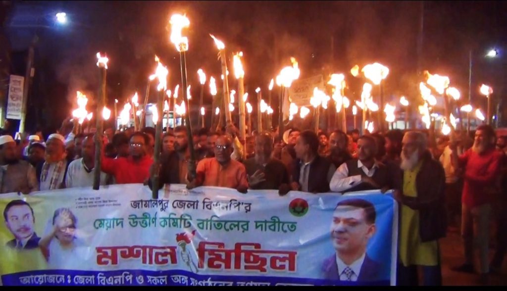 জামালপুরে জেলা বিএনপির মেয়াদোত্তীর্ণ কমিটি বাতিলের দাবিতে মশাল মিছিল