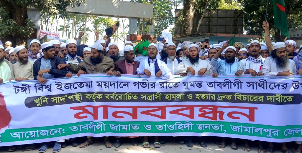 নিজস্ব প্রতিবেদক,দৈনিক জামালপুর বার্তা: টঙ্গী ইজতেমা ময়দানে গভীর রাতে উগ্র সন্ত্রাসী সাদ পন্থীদের অতর্কিত ও বর্বরোচিত হামলায় ৪ জনের মৃত্যুসহ শতাধিক আহত ও নিখোঁজের ঘটনায় তীব্র প্রতিবাদ জানিয়ে হামলাকারীদের দ্রুত গ্রেপ্তার ও সাদ পন্থীদের নিষিদ্ধের দাবিতে মানববন্ধন অনুষ্ঠিত হয়েছে।