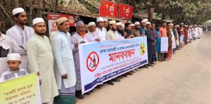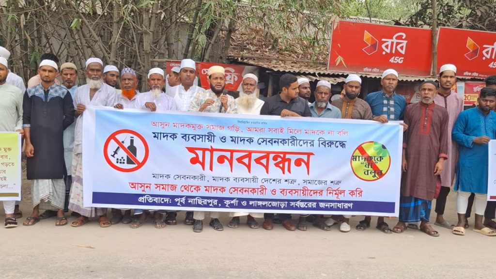 আজ ( ৪ এপ্রিল ) শুক্রবার জুমার নামাজের পর পৌর শহরের পূর্ব নাছিরপুর সরকারি প্রাথমিক বিদ্যালয়ের সামনে পূর্ব নাছিরপুর, কুর্শা ও লাঙ্গলজোড়া এলাকার সর্বস্তরের মানুষ এই মানববন্ধনের আয়োজন করেন।