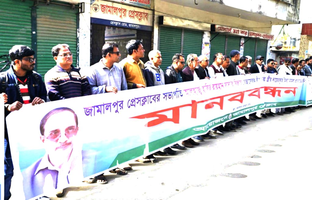 শনিবার দুপুরে জামালপুর প্রেসক্লাব এ মানববন্ধনের আয়োজন করে। জামালপুর প্রেসক্লাবের সামনে ঘন্টাব্যাপী এ মানববন্ধনে জামালপুর প্রেসক্লাবের সাধারণ সম্পাদক লুৎফর রহমানের সভাপতিত্বে ও প্রেসক্লাবের কোষাধ্যক্ষ কাফি পারভেজের সঞ্চালনায় বক্তব্য রাখেন, প্রেসক্লাবের যুগ্ম সাধারণ সম্পাদক আনোয়ার হোসেন, দৈনিক সচেতন কন্ঠের সম্পাদক বজলুর রহমান, দৈনিক ইত্তেফাকের সাংবাদিক এস এম আব্দুল হালিম, জামালপুর টেলিভিশন জার্নালিস্ট এসোসিয়েশনের সাধারণ সম্পাদক আনোয়ার হোসেন মিন্টু, জামালপুর অন-লাইন জার্নালিস্ট এসোসিয়েশনের সভাপতি শওকত জামান, আর টিভি’র জেলা প্রতিনিধি সুবিনয় রায় তপু, জামালপুর নাগরিক ভয়েস’র সাধারণ সম্পাদক মশিউর রহমান, জামালপুর মডেল প্রেসক্লাবের সভাপতি মোস্তাফিজুর রহমান, জামালপুর রিপোটার্স ক্লাবের সভাপতি আতিকুল ইসলাম রুকন, জামালপুর জেলা যুব দলের সিনিয়র যুগ্ম আহবায়ক হাসান সরোয়ার মঞ্জু, বাংলাদেশ ফটো জার্নালিস্ট এসোসিয়েশন জামালপুরের আহবায়ক শাহাবুল আকন্দ, সদস্য সচিব শহিদুল ইসলাম তুফান, সাংবাদিক ইউনিয়ন জামালপুরের সভাপতি সুকান্ত চক্রবর্তী, মেলান্দহ প্রেসক্লাবের সভাপতি আজম খান, সিনিয়র সহ-সভাপতি আব্দুল হাই, দেওয়ানগঞ্জ প্রেসক্লাবের সাবেক সভাপতি খাদেমুল ইসলাম, সরিষাবাড়ী উপজেলা প্রেসক্লাবের সাধারণ সম্পাদক তৌহিদুল ইসলাম হাসু, ই-প্রেসক্লাব জামালপুরের সাধারণ সম্পাদক জাহাঙ্গীর আলম, জাতীয় সাংবাদিক সংস্থা জামালপুর জেলা শাখার সাধারণ সম্পাদক আহসান হাবীব স্বপন, বৈষম্য বিরোধী ছাত্র আন্দোলন জামালপুর জেলা শাখার যুগ্ম আহবায়ক রেহামান বিন শাওন, বাংলাদেশ রিপোটার্স ক্লাব জামালপুর জেলা শাখার সভাপতি মুক্তাদির হোসেন সেলিম প্রমুখ।