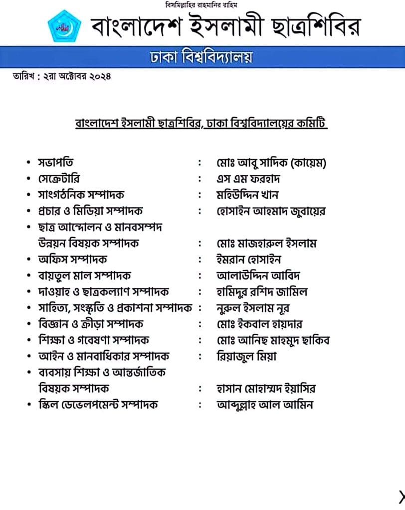 বাংলাদেশ ইসলামী ছাত্রশিবিরের ঢাকা বিশ্ববিদ্যালয় (ঢাবি) শাখার সভাপতি সাদিক কায়েম ও সেক্রেটারি জেনারেল এস এম ফরহাদের আত্মপ্রকাশের পর এবার পূর্ণাঙ্গ কমিটি প্রকাশ্যে এসেছে।