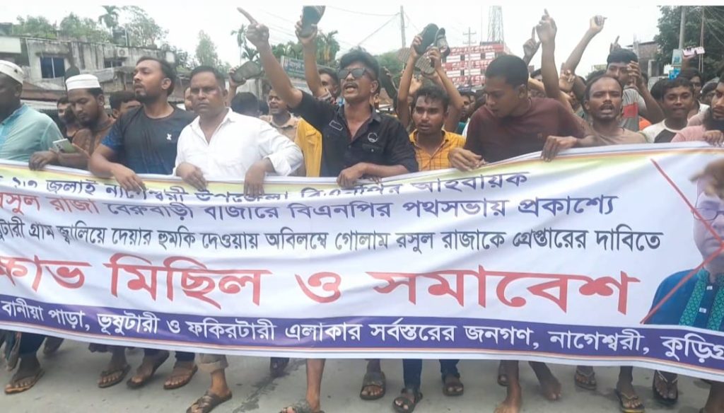 গত ২৩ জুলাই নাগেশ্বরী উপজেলার বিএনপির আহবায়ক গোলাম রসুল রাজা বেরুবারী ইউনিয়ন পথসভায় নাগেশ্বরী পৌরসভার বানিয়া পাড়া, ভূষুটারী গ্রাম জ্বালিয়ে দেওয়ার হুমকিতে ফুসিয়ে উঠেছে অত্র এলাকার সাধারণ জনগণ।