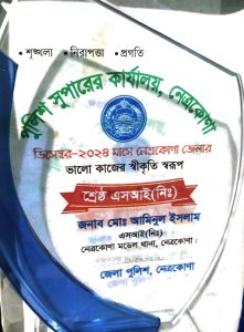নেত্রকোনা জেলায় ডিসেম্বর ২০২৪ মাসে ভালো কাজের সৃকৃতি সরূপ শ্রেষ্ঠ এসআই নির্বাচিত হয়েছেন মো: আমিনুল ইসলাম।