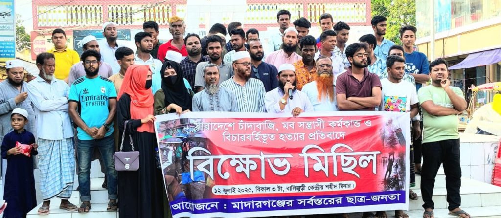 রমজান আলী, মাদারগঞ্জ (জামালপুর) প্রতিনিধি: ভাঙারি ব্যবসায়ী লাল চাঁদ ওরফে সোহাগকে প্রকাশ্যে পাথর মেরে নির্মমভাবে হত্যার প্রতিবাদে মাদারগঞ্জে এক প্রতিবাদ বিক্ষোভ অনুষ্ঠিত হয়েছে। শুক্রবার বিকেলে বালিজুড়ী বাজার কেন্দ্রীয় শহীদ মিনারে সর্বস্তরের ছাত্র-জনতার ব্যানারে এ বিক্ষোভ কর্মসূচি পালিত হয়।