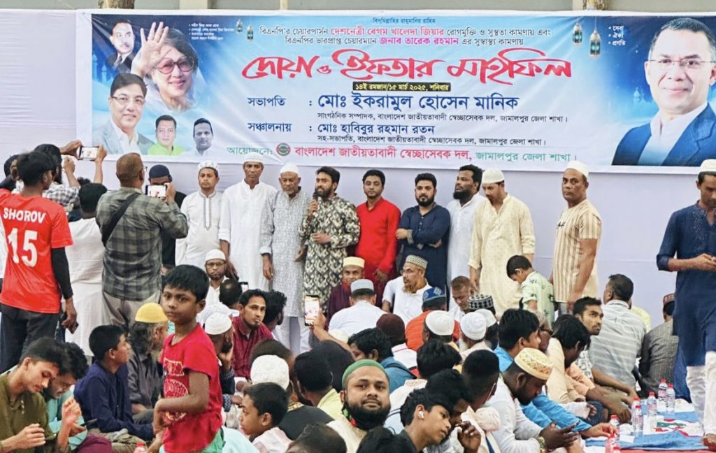 নিজস্ব প্রতিবেদক : বিএনপির চেয়ারপার্সন দেশনেত্রী বেগম খালেদা জিয়ার রোগমুক্তি এবং বিএনপির ভারপ্রাপ্ত চেয়ারম্যান তারেক রহমানের সুস্থতা কামনায় জামালপুরে দোয়া ও ইফতার মাহফিল করেছে জেলা স্বেচ্ছাসেবক দলের নেতৃবৃন্দ।