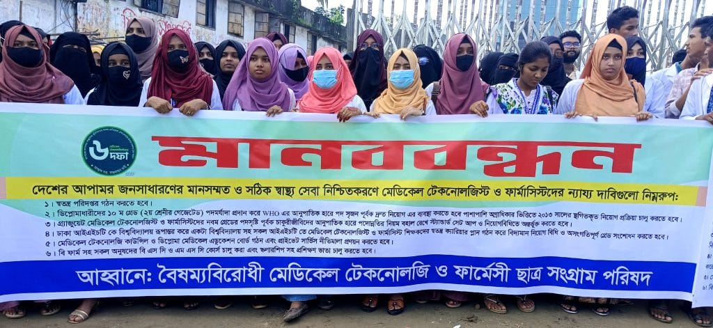 বক্তারা আরও দাবী তুলে ধরে বলেন, গ্র্যাজুয়েট মেডিকেল টেকনোলজিস্টদের জন্য নবম গ্রেডের পদ সৃষ্টি করে স্ট্যান্ডার্ড সেট আপ ও নিয়োগবিধিতে অন্তর্ভুক্ত করতে হবে। মেডিকেল টেকনোলজি কাউন্সিল গঠন করে, মেডিকেল টেকনোলজিস্ট ও ফার্মাসিস্টদের জন্য প্রাইভেট সার্ভিস নীতিমালা প্রণয়ন করতে হবে। বিএসসি ও এমএসসি কোর্সে শিক্ষার্থীদের প্রশিক্ষণ ভাতা এবং স্কলারশিপ প্রদানসহ সব অনুষদের বিএসসি কোর্স চালু করে শিক্ষা ব্যবস্থায় উন্নয়নমূলক পদক্ষেপ গ্রহণ করতে হবে।